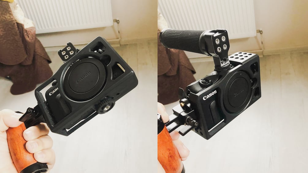 - First version: Simple Cage with accessible camera cold shoe without threads. This version has the holes but without threads wich means that it allows the user to use heat set inserts in the holes or heat up a 1/4 screw and screw it in the hole as it should make the threads itself.